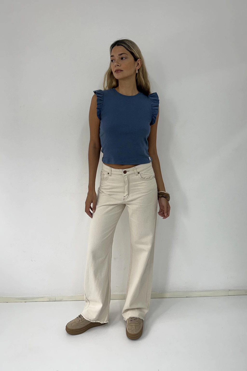 Con calce slim, esta remera básica está confeccionada en tela de ribb. Presenta volados en ambos laterales, lo que le da un detalle único y femenino a la prenda.
